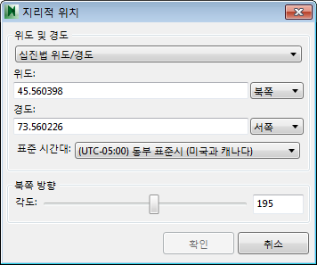 이 대화상자를 사용하여 모형에서 지리적 위치의 위도, 경도 및 북쪽 방향을 설정할 수 있습니다. 장면 뷰에는 사용자화된 표준 시간대의 사용자화된 태양 위치가 표시됩니다.