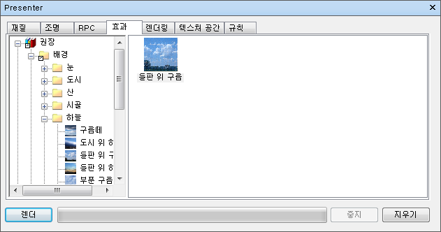 재질, 조명 및 렌더링 탭과 마찬가지로 효과 탭에는 왼쪽 창에 아카이브, 오른쪽 창에 팔레트가 나타납니다. 이 탭에서는 다양한 배경과 전경 효과를 설정할 수 있습니다.