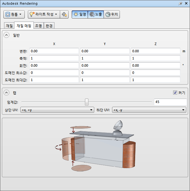 캡 확인란은 원통 캡이 원통 측면과 다른 변환으로 매핑된 텍스처여야 하는지를 결정합니다. 임계값은 점과 원통 축 사이의 각도(도)로, 사용해야 하는 매핑(캡 또는 측면)을 결정하는 데 사용됩니다. 기본적으로 45도에 해당하는 값이 사용됩니다. 캡 방향(상단 UV 및 하단 UV)은 상자 매핑의 방향 매개변수와 마찬가지로 캡에서 텍스처 좌표의 방향을 지정합니다.
