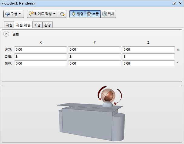 Autodesk Navisworks에서는 선택한 형상에 적합한 매핑 유형을 선택하고 재질 맵의 위치, 방향 및 축척 지정 방식을 조정할 수 있습니다. 재질이 기본 매핑 좌표를 통해 원하는 방식으로 표시되는 경우에는 매핑을 조정할 필요가 없습니다.