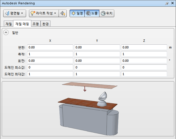 재질 매핑은 3D 좌표와 법선이 2D 텍스처 좌표(UV)로 변환되는 방식을 정의합니다. 이와 같이 변환된 좌표는 텍스처 맵에서 색상 등을 조회하는 데 사용됩니다. 각각의 특정 매핑은 매핑을 수행하는 방법에 대한 서로 다른 '레시피'를 나타냅니다. 일반 섹션의 변환, 축척 및 회전 필드는 3D 점을 텍스처 좌표로 변환하는 각 특정 매핑 유형의 레시피를 적용하기 전에 각 3D 좌표 및 법선에 적용되는 변환을 정의합니다. 도메인 최소값 및 도메인 최대값 필드의 값은 많은 매핑 레시피에서 좌표 공간(X, Y, Z) 맵의 범위(각 좌표에 대한 텍스처 공간에서 최소값 0과 최대값 1 사이로 지정)를 결정하는 데 사용됩니다.