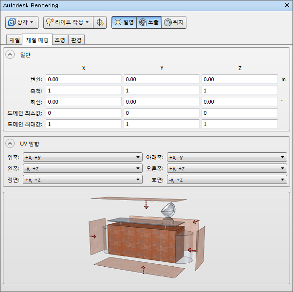 재질 매핑 탭을 사용하여 렌더링 도구막대에서 선택한 재질 매핑 유형의 기본 설정을 사용자화할 수 있습니다. 이 기능은 고급 사용자에게만 권장됩니다.