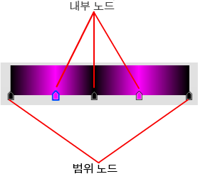 그라데이션의 편집 가능한 표현을 나타냅니다. 그라데이션의 효과가 왼쪽(시작점)에서 오른쪽(끝점)으로 이동합니다. ![]() 노드를 추가하려면 그라데이션 견본에서 아무 곳이나 클릭합니다. 노드를 삭제하려면 노드를 견본 경계 영역 밖으로 끕니다. |