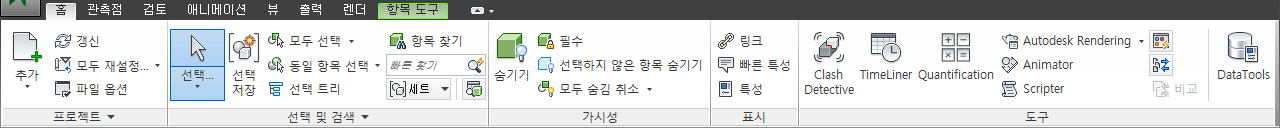 일부 탭은 상황에 따라 바뀝니다. 명령을 실행할 때 도구막대나 대화상자 대신 특별한 상황별 리본 탭이 표시되는 경우가 있습니다. 예를 들어, 장면 뷰에서 항목을 선택하면 바로 이전에 숨겨진 항목 도구 탭이 나타납니다. 선택된 항목이 없으면 이 탭이 다시 숨겨집니다.