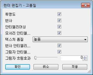 선택한 렌더링 스타일을 편집하려면 팔레트에서 해당 스타일을 두 번 클릭합니다. 렌더 편집기 대화상자가 열립니다. 각 편집기는 렌더링 스타일 유형에 따라 달라집니다. 다음은 고품질 편집기의 모습입니다.