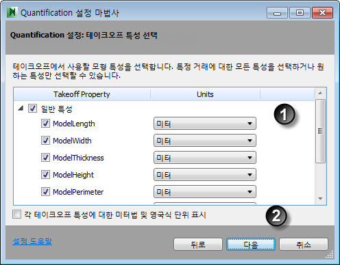 2. 각 테이크오프 특성에 대한 미터법 및 영국식 단위 표시: 각 특성에 대해 프로젝트의 두 가지 측정 단위를 모두 표시합니다.