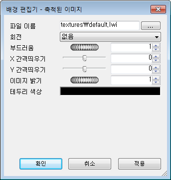 팔레트에서 효과를 두 번 클릭하여 배경 편집기를 엽니다. 각 편집기는 배경 유형에 따라 달라집니다. 다음은 축척된 이미지 편집기의 모습입니다.