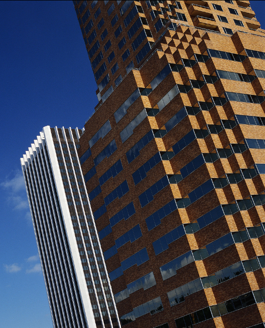 환경 배경의 또 다른 장점은 모형에서 재질의 반사 특성을 통해 환경을 반사할 수 있다는 것입니다. 예를 들어, 유리로 된 빌딩의 위쪽을 바라보면 유리에 하늘이 반사됩니다.