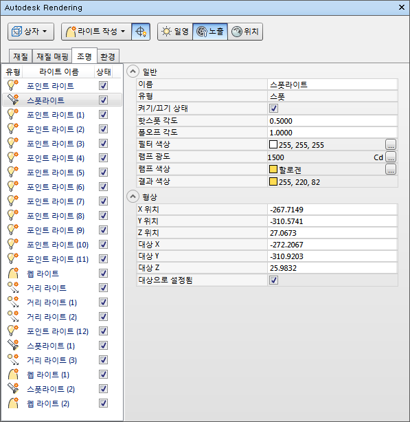 모형에 추가한 각 라이트는 이름 및 유형별로 라이트 뷰에 나열됩니다. 여기에서 상태 확인란을 사용하여 라이트를 켜거나 끌 수 있습니다. 라이트를 마우스 오른쪽 버튼으로 클릭하면 상황에 맞는 메뉴가 표시됩니다. 라이트를 클릭하면 해당 라이트가 선택되고 특성 뷰에 특성이 표시됩니다. 일영 및 스카이 라이트가 포함되지는 않지만 환경 탭에서 일영 및 천공 특성을 조정할 수 있습니다.