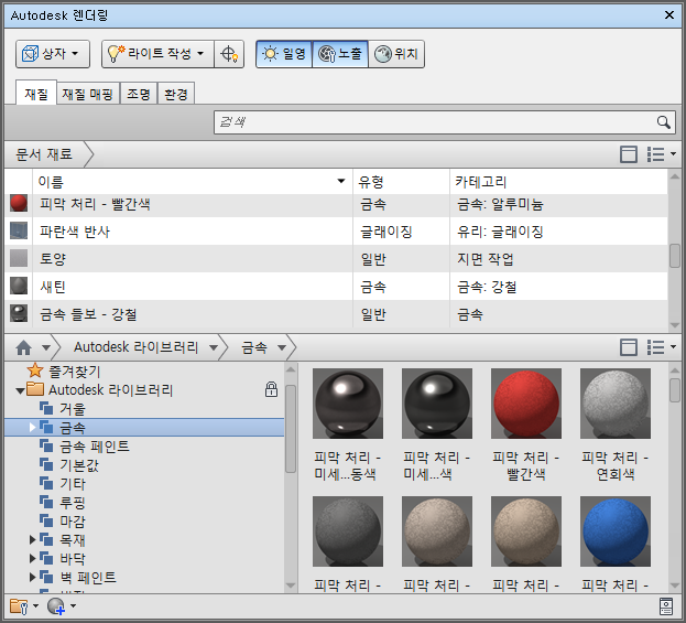 Autodesk Rendering 창을 사용하여 재질 라이브러리, 조명 및 환경 설정에 액세스하고 관련 작업을 수행할 수 있습니다.
