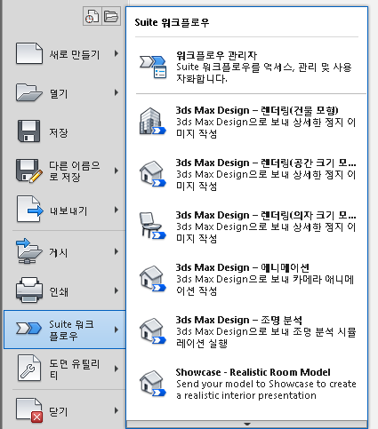 Suite에 따라 원본 제품은 AutoCAD, Inventor 또는 Revit입니다. 대상 제품은 항상 3ds Max Design 또는 Showcase입니다. 제품군과 함께 제공되는 워크플로우는 제품군 레벨(Standard, Premium, Ultimate)에 따라 다를 수 있습니다. eFlex 또는 Term Multi-Flex 라이센스가 있는 엔터프라이즈 사용자는 모든 워크플로우를 사용할 수 있습니다.