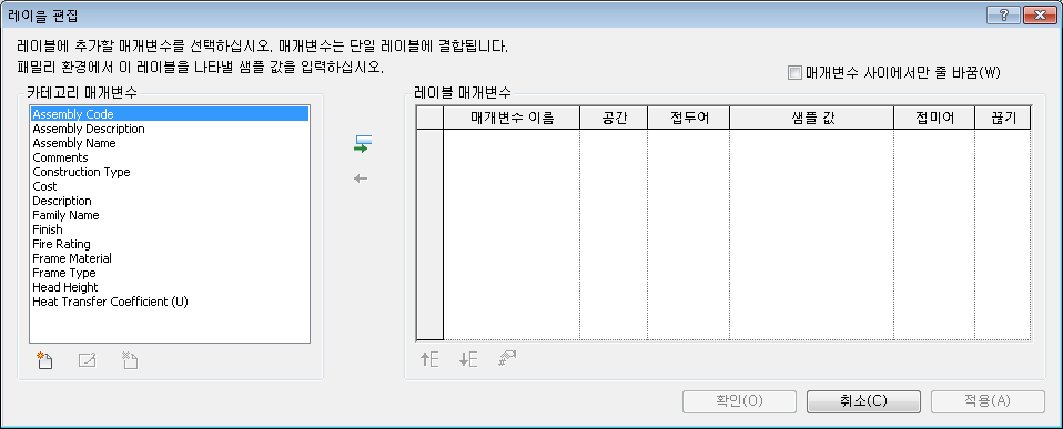 레이블 편집 대화상자를 사용하여 레이블에 하나 또는 여러 개의 매개변수를 지정합니다.