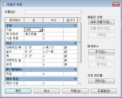 레이블이 지정된 치수 값이 변경되면 패밀리 유형 매개변수 값도 패밀리 유형 대화상자에서 업데이트됩니다. 이 대화상자에는 표시된 대로 치수 간에 관계를 정의하는 수식을 입력할 수 있습니다.