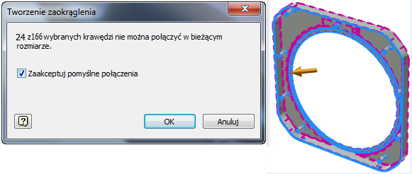 W poprzednich wersjach programu, jeśli utworzenie jednej krawędzi w zbiorze wskazań zaokrąglenia się nie powiodło, całe zaokrąglenie kończyło się niepowodzeniem. W tej wersji wszystkie błędy połączenia powodują otwarcie okna dialogowego z opcją zaokrąglenia pomyślnie utworzonych krawędzi.