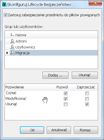 Zgodnie z procedurą zdefiniowaną w temacie Konfiguracja zabezpieczeń cyklu rozwojowego elementu należy dodać użytkownika „Migracja” do zabezpieczenia cyklu rozwojowego elementu i przyznać mu uprawnienia do odczytu i modyfikowaniu dokumentów dołączonych do elementów. W ramach procesu migracji nie powinno być konieczne usuwanie jakichkolwiek danych, warto więc na wszelki wypadek zabronić usuwania danych.