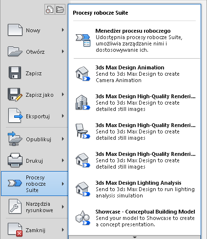 Proces roboczy Suite to mechanizm eksportowania opracowanego projektu ze źródłowego produktu Autodesk do produktu docelowego w celu wykonania szczegółowego renderowania lub animacji. Ustawienia w procesie roboczym powodują automatyczne przekształcenie obiektów projektu w prezentację w programach 3ds Max Design lub Showcase. Na przykład proces roboczy renderowania zewnętrznego 3ds Max Design renderuje zewnętrzne powierzchnie projektu budynku wraz ze światłami i cieniami. Proces roboczy animacji więzów Showcase przedstawia zespół mechaniczny w ruchu, przekształcając więzy zakresu w animowane zachowania. Procesów roboczych można używać do przygotowywania przeglądów projektu i tworzenia sugestywnych prezentacji.