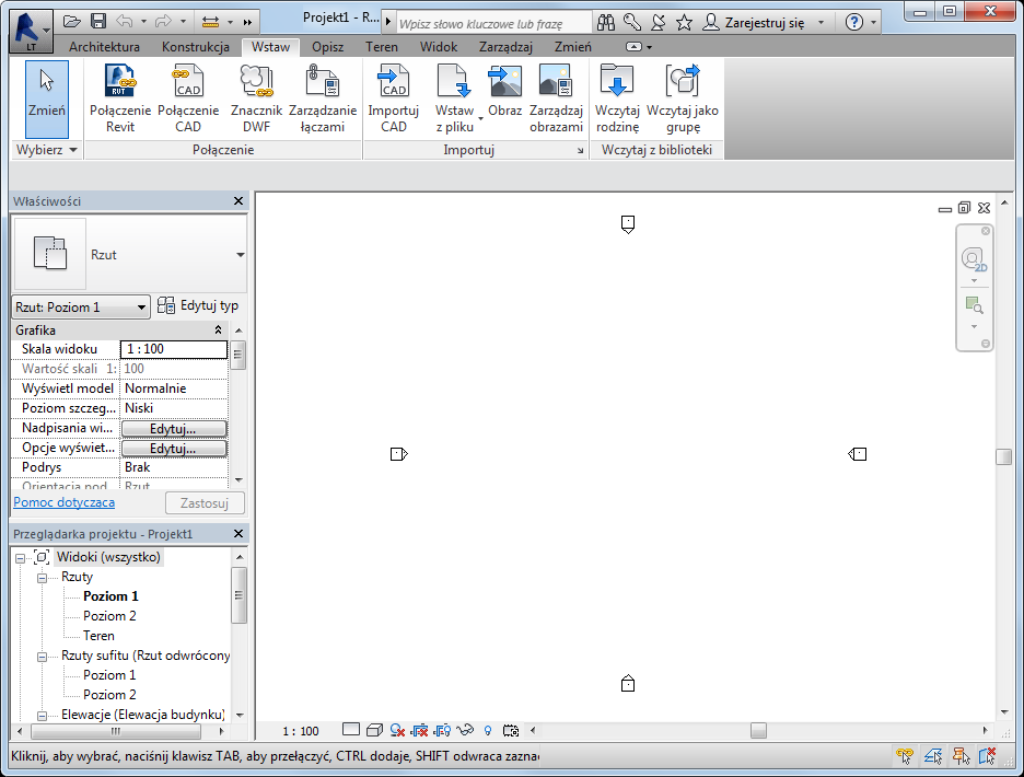 Obszar rysunku widoczny w oknie programu Revit przedstawia widoki (oraz arkusze i zestawienia) bieżącego projektu. Przy każdym otwarciu widoku w projekcie jest on wyświetlany domyślnie w obszarze rysunku na wierzchu wszystkich innych otwartych widoków. Pozostałe widoki są nadal otwarte, ale znajdują się pod spodem bieżącego widoku. Użyj narzędzi dostępnych na karcie Widokw panelu Okna w celu rozmieszczenia widoków, tak aby odpowiadały stylowi pracy.