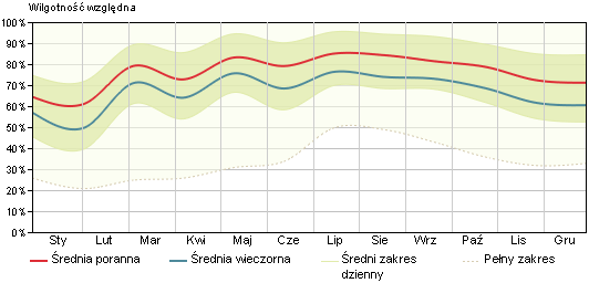 Ponieważ wilgotność może ulegać znacznym wahaniom w ciągu jednego dnia i zazwyczaj jest wyższa rano, na wykresie jest pokazana średnia poranna i średnia wieczorna.