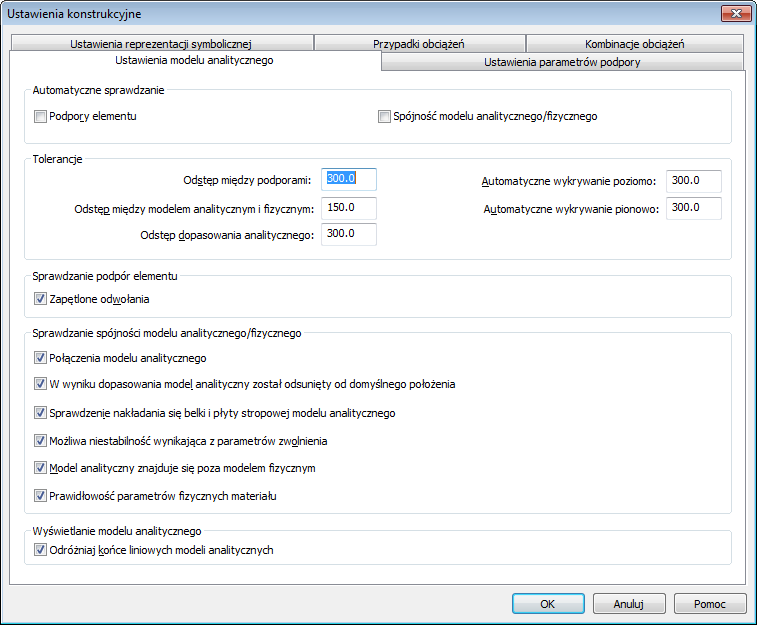 Karta Ustawienia modelu analitycznego w oknie dialogowym Ustawienia konstrukcyjne umożliwia dostosowywanie ustawień określających, w jaki sposób w programie Revit będą wykonywane określone zadania dotyczące modelu analitycznego. Wszystkie ustawienia w tym oknie dialogowym są specyficzne dla danego projektu i są zapisywane w projekcie.