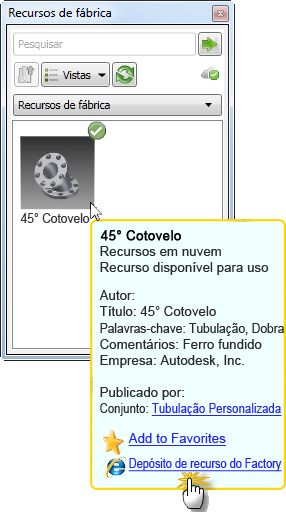 - Uma vez publicado o recurso na nuvem, ele se torna disponível para download no Navegador de recursos. Acesso ao Depósito de recursos do Factory é fornecido através do Navegador de recursos com base na nuvem .