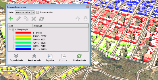(Adicionar um novo tema). Por exemplo, para criar um tema que compara a altura de construções, selecione a classe de recurso Construções e, a seguir, selecione a propriedade Roof Height (Altura da cobertura). Os valores mínimo e máximo para essa propriedade são exibidos. Não é possível alterá-los.