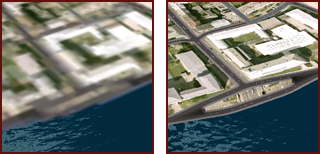 Uma configuração de nível de detalhe alto (direita) exibe a textura ou estilo com a maior precisão possível quando você está perto do recurso ou quando define uma maior qualidade. O detalhe é reduzido gradualmente (esquerda) à medida que você se afasta ou ao reduz a qualidade. |