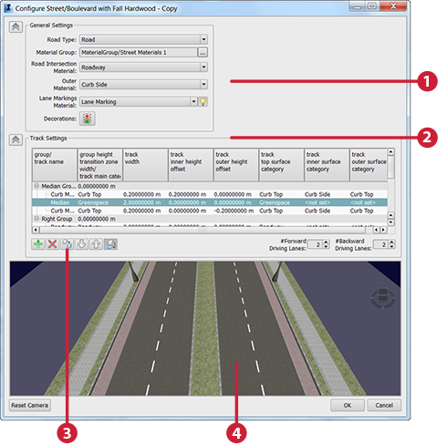 | Deslocamento da altura interna do trajeto | Insira a altura inicial da estrada correspondente na coluna Nome do trajeto, em relação ao trajeto anterior na coluna. A altura inicial baseia-se na linha central da superfície da estrada. Isto permite definir o perfil da estrada como uma curva de "escada" para a modelagem de valas e meio-fio. |