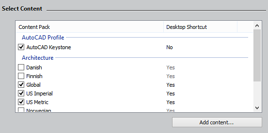 Para instalar, selecione os pacotes de conteúdo de AutoCAD Profile and Architecture (imperial EUA, métrico EUA e RU). Você também pode especificar uma nova localização para o arquivo da Biblioteca do Navegador de Conteúdo.