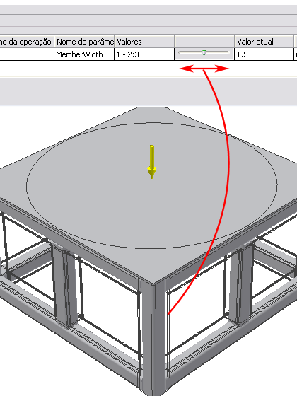 Crie uma faixa de configurações geométricas, envolvendo a largura dos componentes do modelo, para facilitar a otimização do peso. Em primeiro lugar, exiba os parâmetros do modelo para usá-los como parâmetros de simulação.