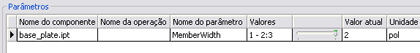 - Na seção Parâmetros, na linha base_plate.ipt do parâmetro Largura do Membro, insira 1-2 na célula Valores. Pressione Enter para atualizar o conteúdo da linha.