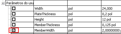 - Na caixa de diálogo Selecionar Parâmetros, ative a caixa de seleção situada junto ao parâmetro Largura do Membro para incluir o parâmetro na tabela paramétrica.