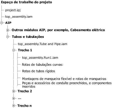 Rotas de tubos e tubulações rígidas são inseridos diretamente em um trecho, mas cada rota de mangueira flexível é inserida em uma submontagem de mangueira flexível e, então, em um trecho. Cada trecho pode conter uma ou mais rotas rígidas e montagens de mangueira flexível.