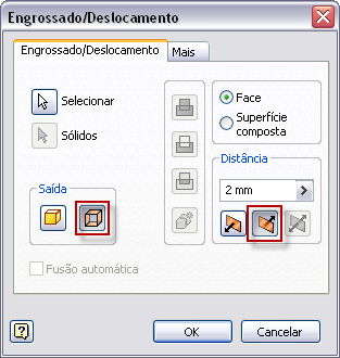 - Na caixa de diálogo, defina a Saída em Superfície e selecione a superfície de extrusão para satisfazer a seleção. Defina a direção da nova superfície para o interior do corpo. Defina a Distância para 2 mm. Clique em OK para criar a superfície.