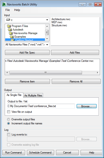- A caixa de diálogo Autodesk Navisworks do Autodesk Navisworks é exibida, e o caminho para o modelo atual é automaticamente adicionado à área Input da caixa de diálogo.