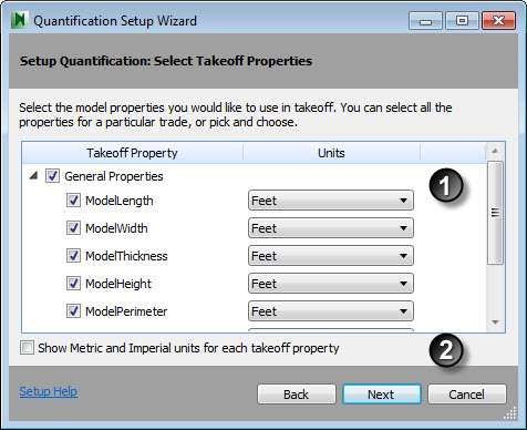 1. Propriedades de levantamento: selecione uma unidade no menu suspenso para cada propriedade.