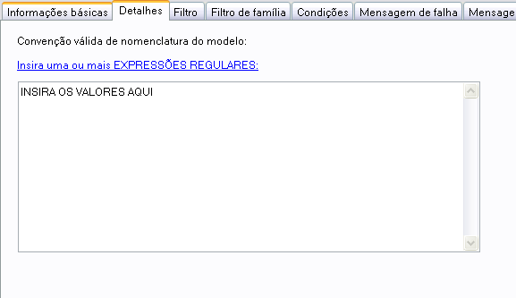 | Convenção de nomenclatura do modelo válida | Inserir o nome da Expressão regular. |