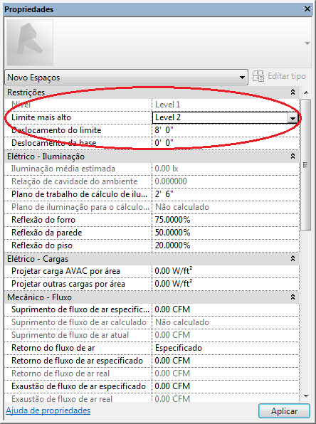 Se a extensão vertical estiver além de um elemento de delimitação de ambiente, como um piso ou teto, o espaço efetuará o snap para o elemento de delimitação de ambiente. No entanto, os controles de arraste e as cotas interativas indicarão a extensão vertical especificada, como mostrado abaixo.