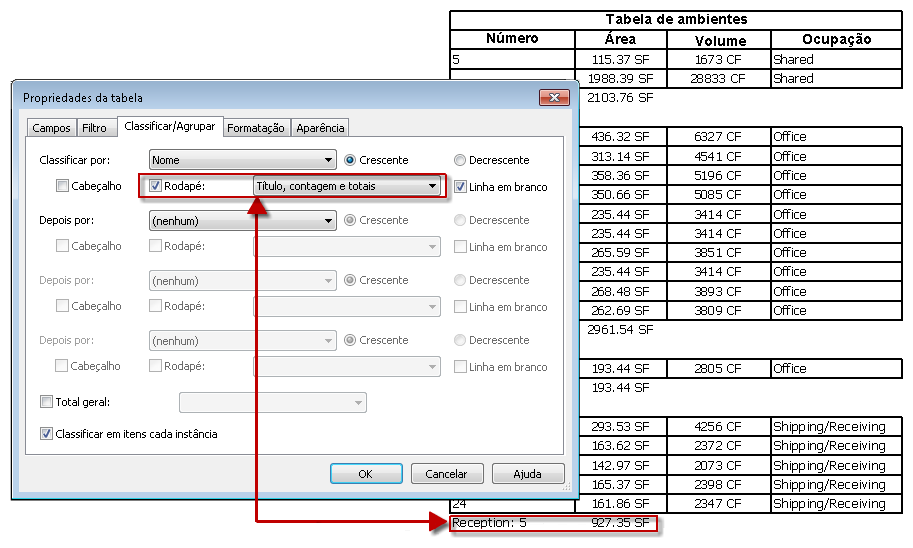 As imagens a seguir ilustram os exemplos de classificação e agrupamento para tabelas, incluindo instâncias relacionadas, classificação e totais.