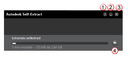 To extract your files, double-click the .EXE file after all parts of the download have completed. If your Autodesk product is larger than 4 GB, and packaged in multiple .EXE files, you can click any one of the parts to start the extraction. All parts will be extracted in a single operation. Self-Extract asks you to confirm the destination folder for the extracted files, and allows you to change it. While files are being extracted, you can use the controls shown in the figure.