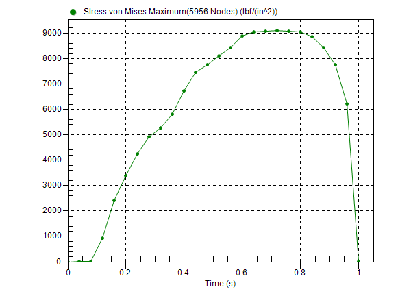 The displacement magnitude values appear by default. We will display the von Mises stress results and animate them. We will also plot the time history of the maximum von Mises stress.