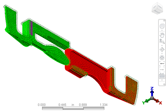 For this plastic snap-fit clip assembly, we will determine and graph the stress as a function of time throughout the analysis event as the two parts are pushed together. Because the clip is symmetrical about two planes, the model is a quarter-symmetry representation of the assembly.