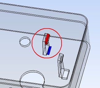 As saídas negativas são apresentadas a vermelho e as áreas sombreadas são apresentadas a azul. Determine se a saída negativa é causada por um erro no modelo da peça ou se é necessário para o objetivo de desenho da peça. Se a peça contiver saídas negativas necessárias, uma solução possível poderá ser remover as áreas sombreadas ou as áreas de saídas negativas da peça. Desta forma, a peça pode ser ejetada normalmente sem grandes alterações no molde.