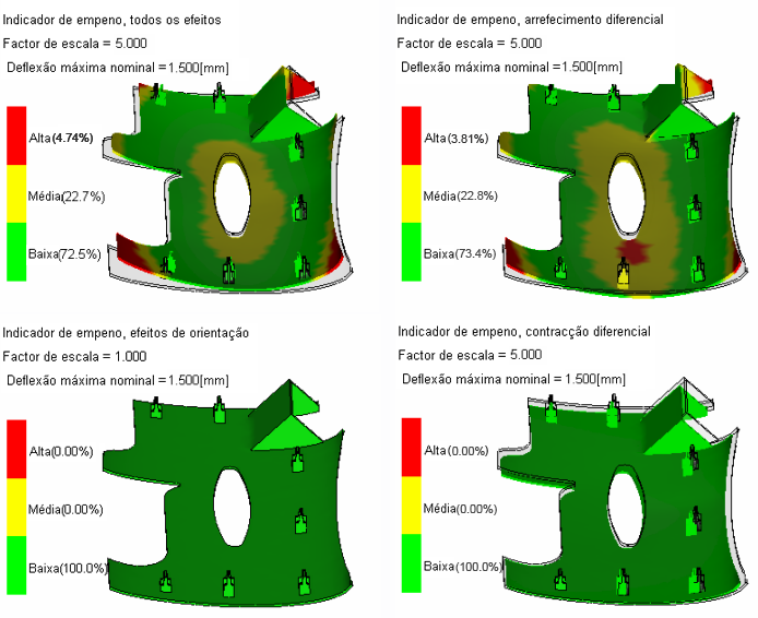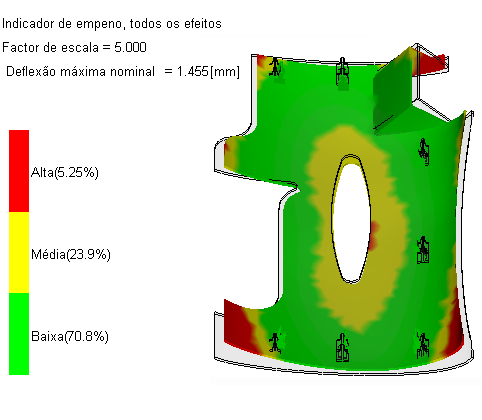 Este resultado mostra a magnitude relativa do empeno (alteração na forma para fora do plano) para as peças. As áreas verdes têm menos de 80% e as áreas vermelhas têm pelo menos 120% da deflexão máxima nominal cotada. O valor predefinido para a Deflexão máxima nominal é metade da espessura média da parede da peça. A deflexão é exagerada cinco vezes, para ter uma melhor visualização.