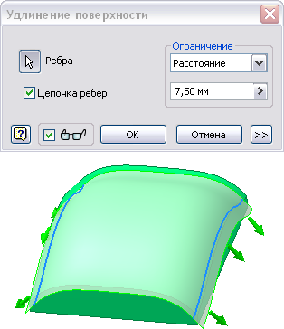 - Выберите два внешних ребра смещенной поверхности для параметра "Ребра". Укажите значение смещения 7,5 мм. Нажмите кнопку ОК для завершения команды.
