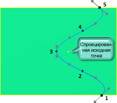 Создайте сплайн с пятью определяющими точками, как показано на рисунке ниже. Дважды щелкните кнопкой мыши последнюю точку для завершения создания сплайна. Положение ручек на сплайне может не совпадать с их положением на рисунке.