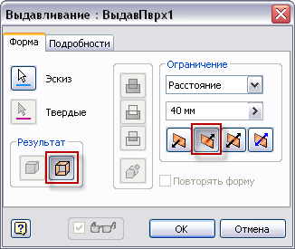 Активируйте команду Выдавливание. Установите для параметра "Вывод" значение Поверхность и выберите сплайн для параметра "Профиль". Установите для параметра "Расстояние" значение 40 мм. Измените направление выдавливания на обратное, чтобы профиль пересекал существующие тела. Нажмите кнопку ОК для создания поверхности.