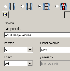 - Выберите параметр Резьбовое отверстие. Установите для параметра тип резьбы значение Контур, для параметра Размер - значение 6, а для параметра Обозначение - значение M6x1.