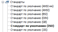 . В обозревателе стандартный список отображает все стандарты, доступные в библиотеке стилей. Стандарт по умолчанию (ISO ) отмечен жирным шрифтом, означающий, что стандарт активен в чертеже в данный момент.