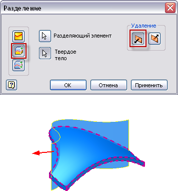 - Выберите параметр Обрезать твердое тело; выберите поверхность в качестве инструмента разделения. Убедитесь, что удаляемая часть направлена в сторону от материала.