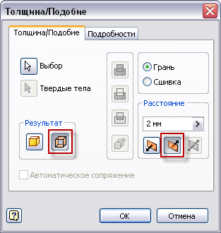 - Установите в диалоговом окне для параметра Вывод значение "Поверхность" и выберите выдавленную поверхность. Установите направление новой поверхности к внутренней части тела. Установите для параметра "Расстояние" значение 2 мм. Нажмите кнопку ОК для создания поверхности.